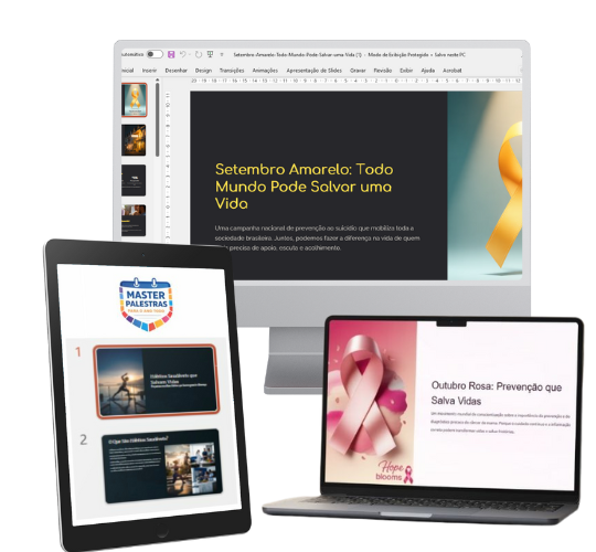 Você terá acesso a 120 Master Palestras Prontas e editáveis com conteúdo completo e slides com design profissional. São Palestras sobre os 12 temas mais desejados e bem pagos pelo mercado.