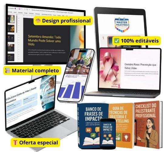 Você terá acesso a 120 Master Palestras Prontas e editáveis com conteúdo completo e slides com design profissional. São Palestras sobre os 12 temas mais desejados e bem pagos pelo mercado.