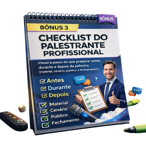 BÔNUS 3 - CHECKLIST DO PALESTRANTE PROFISSIONALPasso a passo do que preparar antes, durante e depois da palestra (material, cenário, público e fechamento).