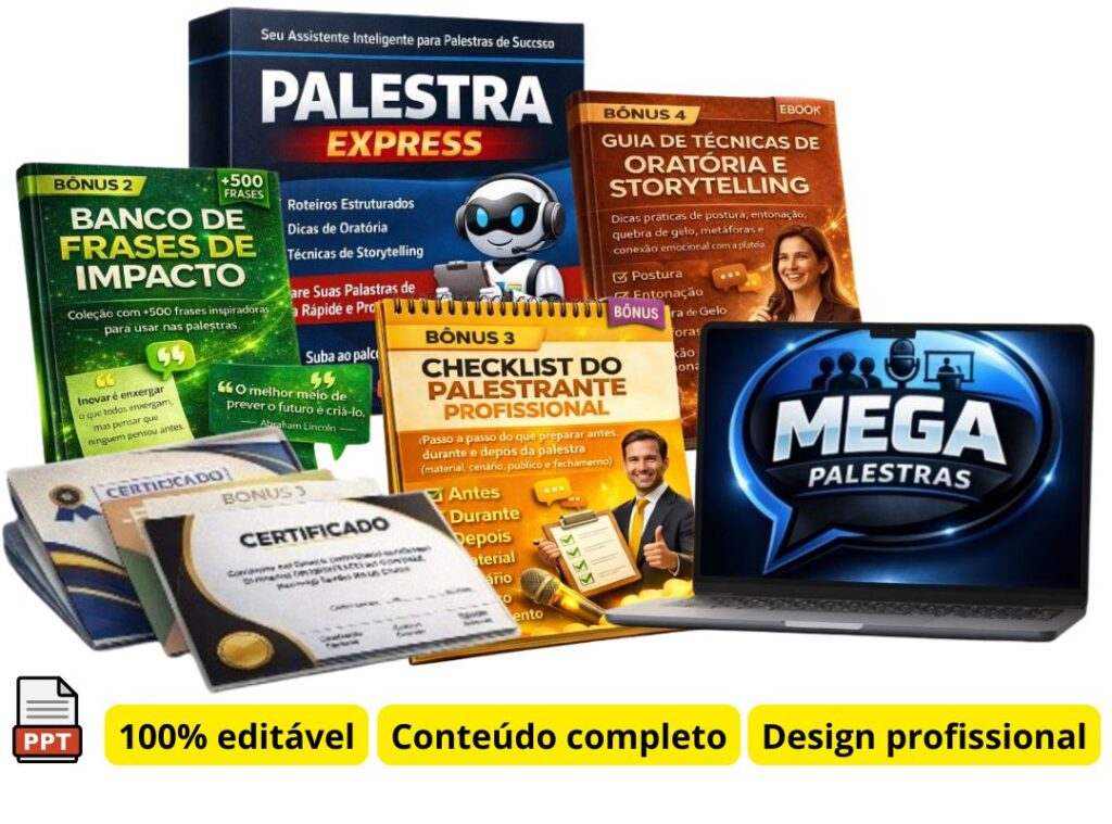 Você terá acesso a 280 Mega Palestras Prontas e editáveis com conteúdo completo e slides com design profissional. São Palestras sobre os 14 temas mais desejados e bem pagos pelo mercado.